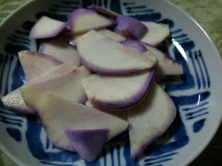 2009-12-22 野沢菜の食べ方 中山農園の秘密 ●野沢菜の根っこをどうやって食べるのか調べてみると、スライスしてサラダ、煮込みなど蕪と同じような調理方法があるということだった。 詳しくはこちら 我が家ではスライスして塩を振ってしんなりしたところで食べた。 やや固めだがほんのりとした甘みがあった。 表皮の薄紫色が美しい。 ●菜っ葉の方は、家内が塩と鷹の爪、昆布などと一緒に漬けた。 ネットには1ヶ月ほどで食べられるいうから1月下旬ごろが食べ頃か。